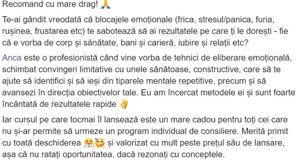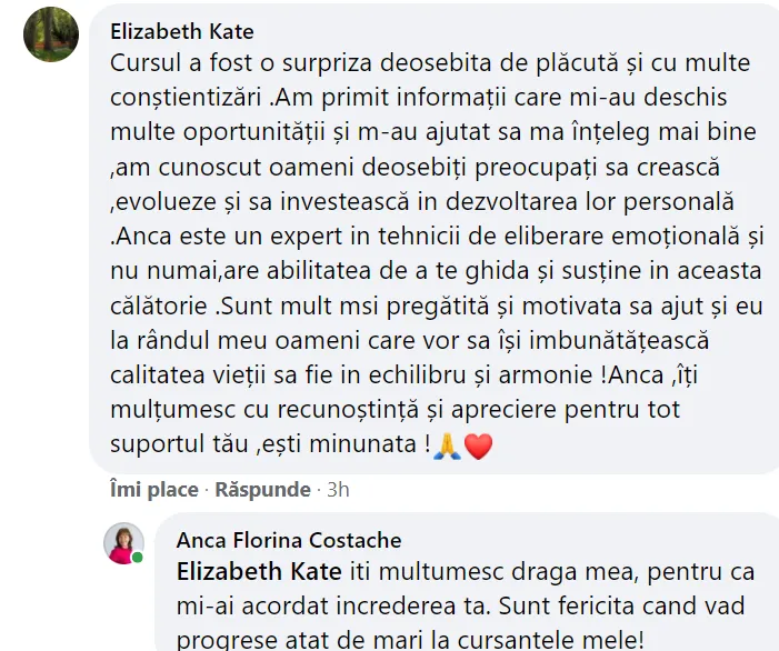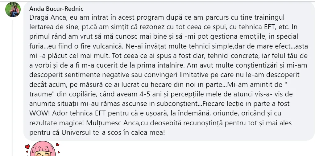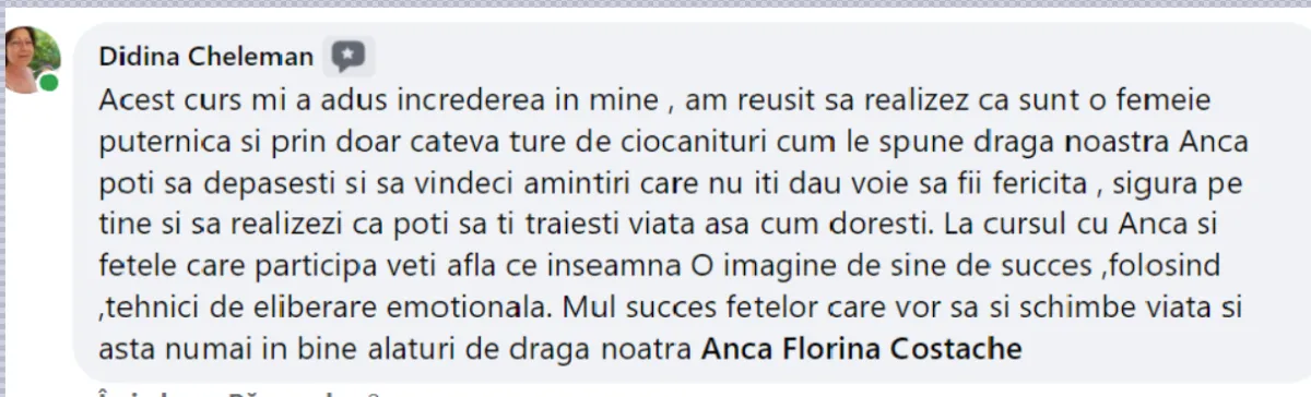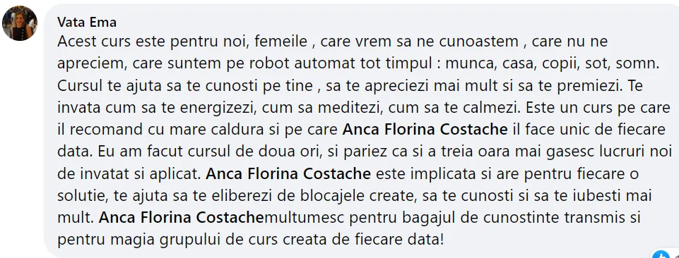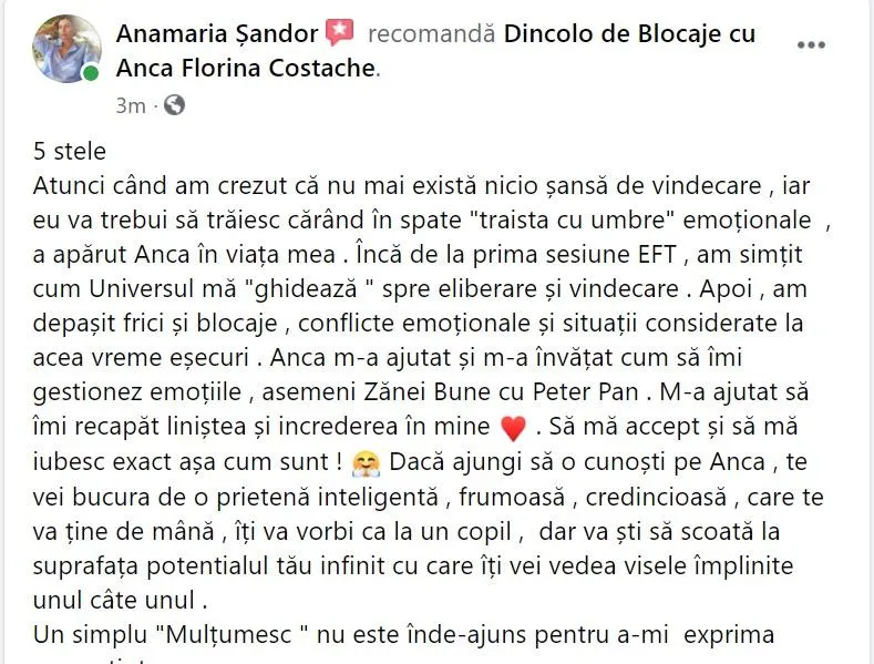 Anca Florina Costache este un om minunat, dedicat, care m-a ajutat cu drag. Este omul alături de care poți face schimbări magice în viața ta, prin acele obiceiuri mici care fac diferența. Meditațiile Ancăi prin tehnica EFT mi-au adus acel echilibru de care aveam nevoie și cu ajutorul cărora am reușit să depășesc cu bine o perioadă solicitantă din viața mea. Acum câțiva ani, într-o situație similară, aș fi apelat la Magne B6, dar azi am ales Anca Florina Costache și tehnicile ei de EFT!